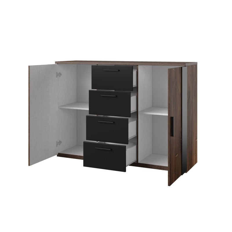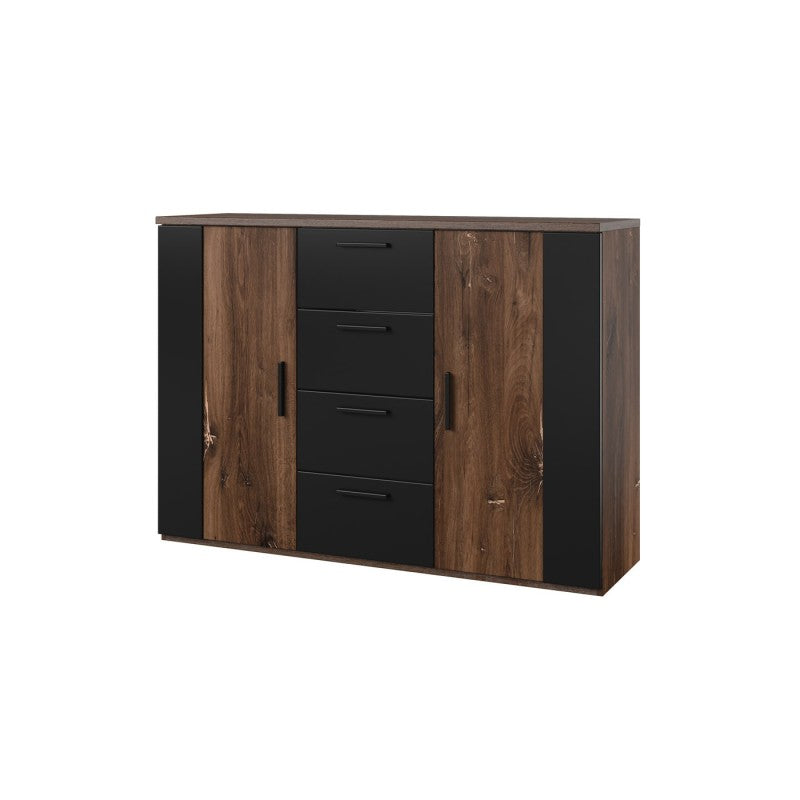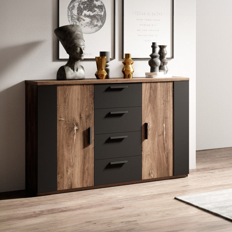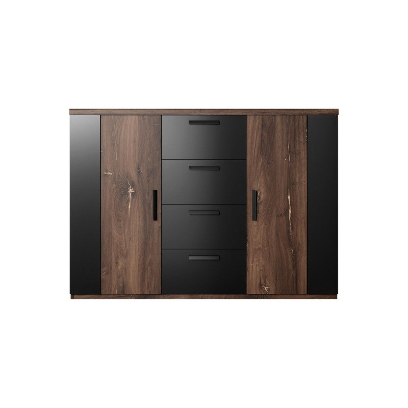 Buffet STAR – 2 portes, 4 tiroirs  Le buffet STAR allie design moderne et chaleur du bois, parfait pour organiser et sublimer votre espace de vie. Il se compose de 4 tiroirs centraux et de 2 portes latérales, offrant un rangement optimal pour la vaisselle, le linge ou vos objets du quotidien.  Dimensions :  Largeur : 94,1 cm  Hauteur : 132 cm  Profondeur : 40 cm  Coloris disponibles :  Chêne clair & noir mat  Chêne foncé & noir mat  Le buffet STAR combine esthétique contemporaine et praticité, idéal pour un séjour ou une salle à manger moderne.